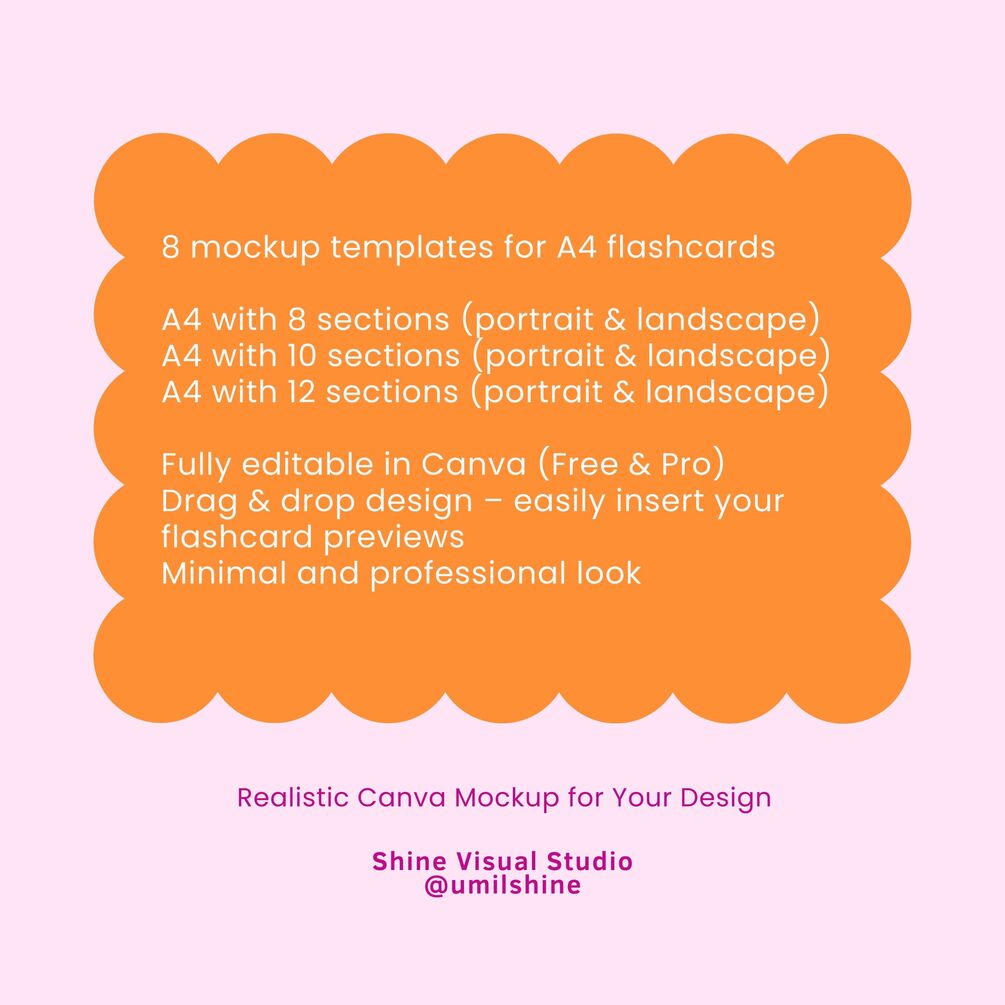 This pack includes 8 Canva mockup templates for A4 flashcards with multiple layouts, perfect for showcasing your educational products or digital downloads.